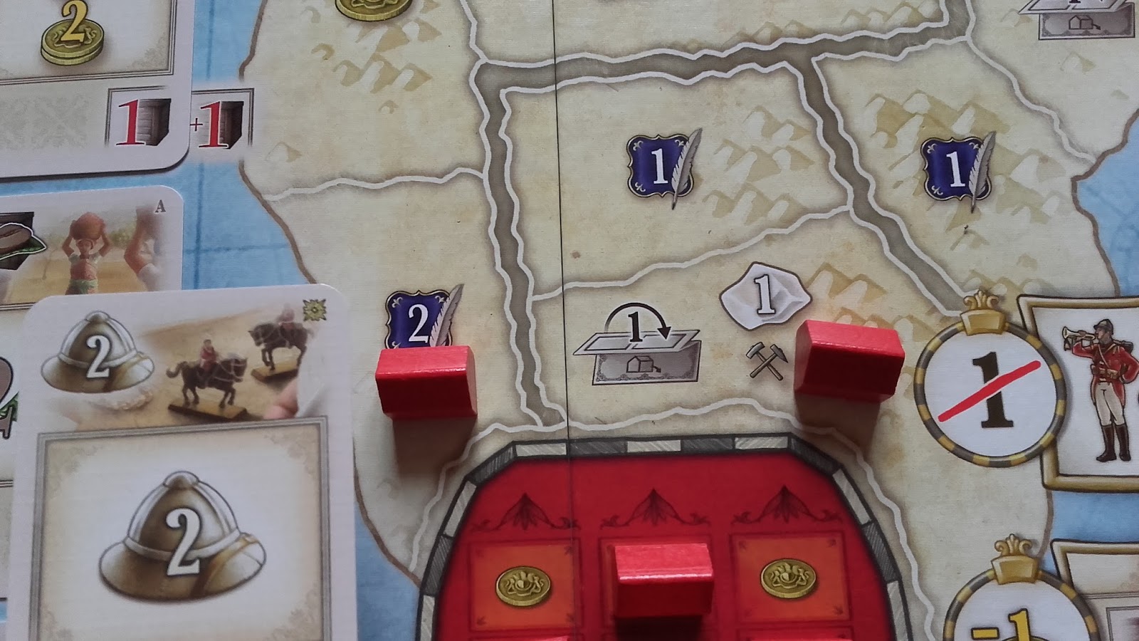 Używając karty ekspansji o wartości 2, gracz umieszcza na planszy dwie faktorie czerwonej kompanii, tym samym odsłaniając monety w jej siedzibie i zwiększając wartość kompanii. |